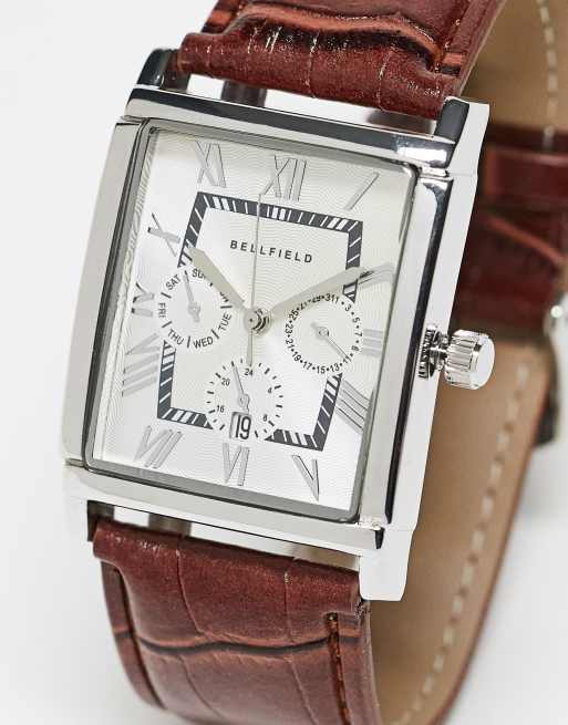 Bellfield – Zegarek z kwadratową tarczą i brązowym paskiem z imitacji skóry
