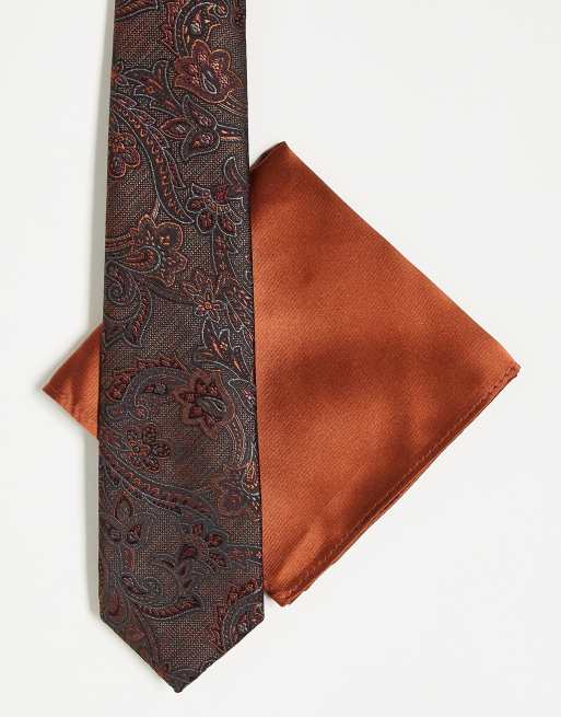 Ben Sherman – Brązowy krawat we wzór paisley i pomarańczowa poszetka