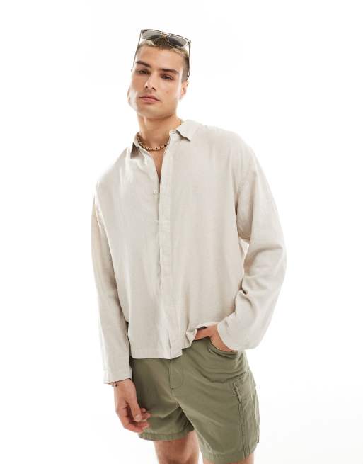 Bershka – Beżowa rustykalna koszula z długimi rękawami z domieszką lnu