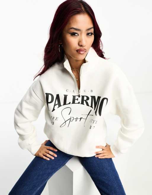 Bershka – Biała bluza dresowa z napisem i zamkiem pod szyją