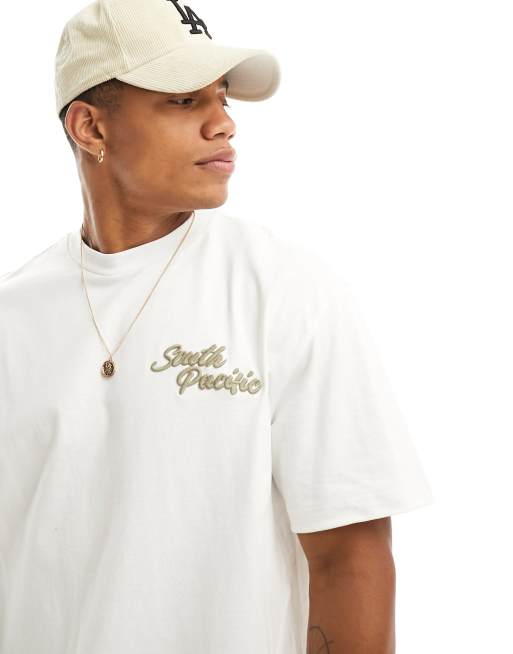 Bershka – Biały T-shirt o pudełkowym kroju z wyhaftowanym „South Pacific”