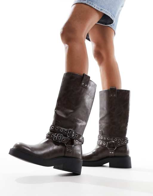 Bershka – Brązowe botki do łydki z ozdobną klamrą