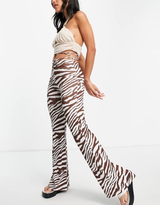 Bershka – Brązowe spodnie z szerokimi nogawkami w zebrę z ozdobnymi paskami