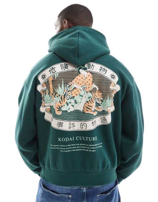 Bershka – Ciemnozielona bluza z kapturem i nadrukiem z motywem tygrysa