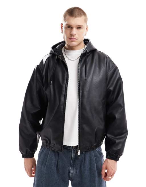 Bershka – Czarna kurtka z kapturem o pudełkowym kroju z imitacji skóry