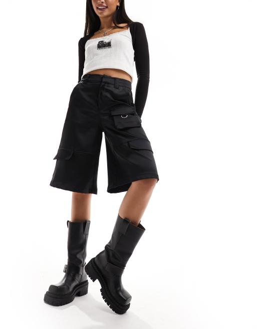 Bershka – Czarne satynowe szorty o wydłużonym fasonie w bojówkowym stylu