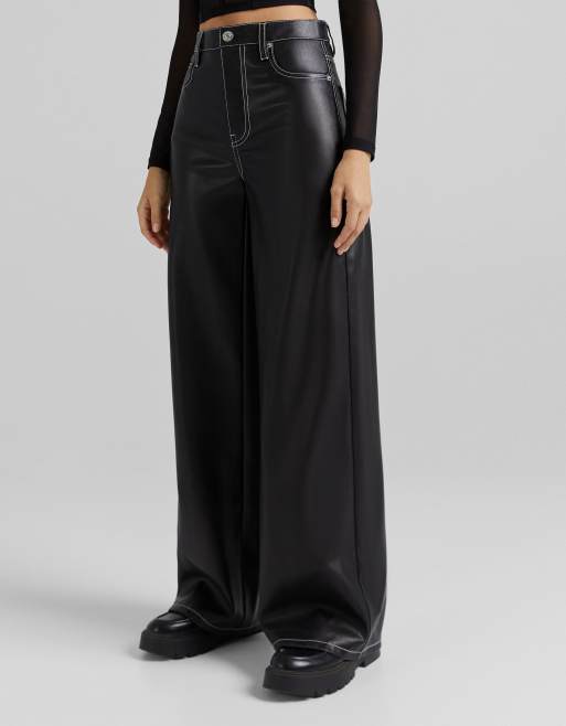 Bershka – Czarne spodnie dad z imitacji skóry z szerokimi nogawkami i kontrastowymi przeszyciami