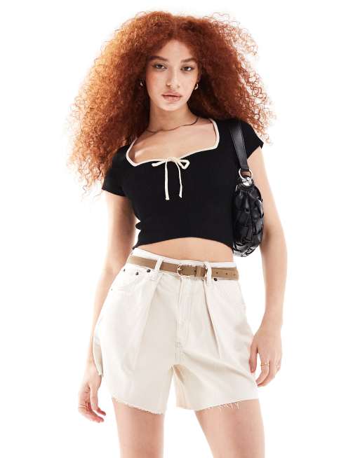 Bershka – Czarny dzianinowy top z kontrastową lamówką i wiązaniem