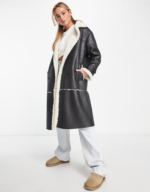 Bershka – Czarny płaszcz o wydłużonym fasonie z kożuszkiem