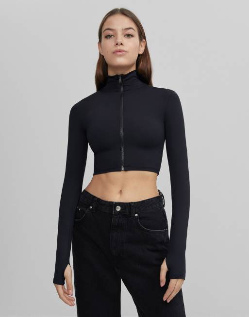 Bershka – Czarny top zapinany na zamek, z długim rękawem i golfem