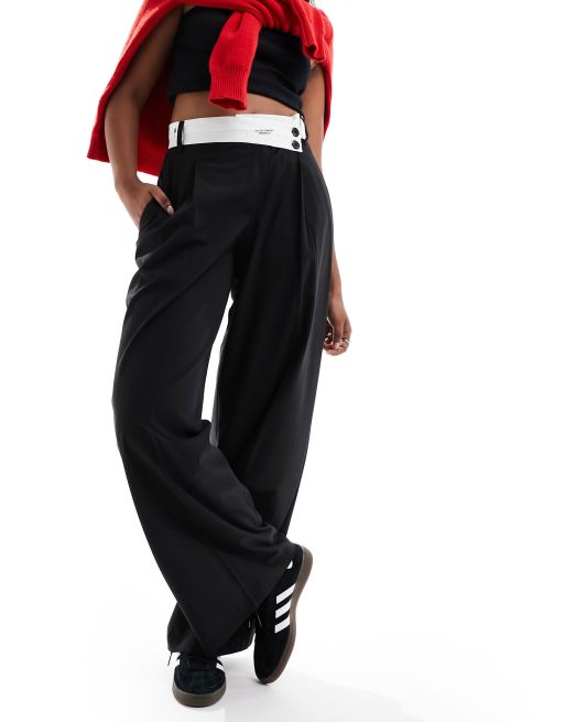 Bershka – Dopasowane czarne spodnie z szerokimi nogawkami i kontrastową talią
