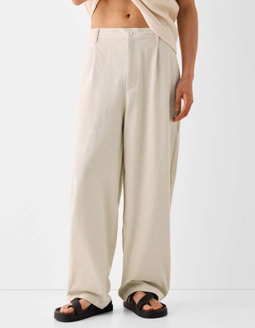 Bershka – Jasnobeżowe dopasowane spodnie z domieszką lnu i szerokimi nogawkami