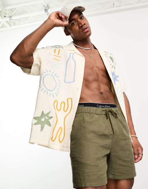 Bershka – Koszula w kolorze ecru z abstrakcyjnym haftem z domieszką lnu