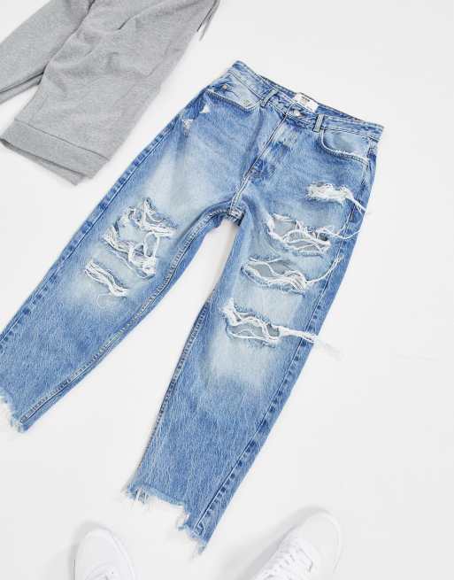 Bershka – Niebieskie jeansy o luźnym kroju z rozdarciami