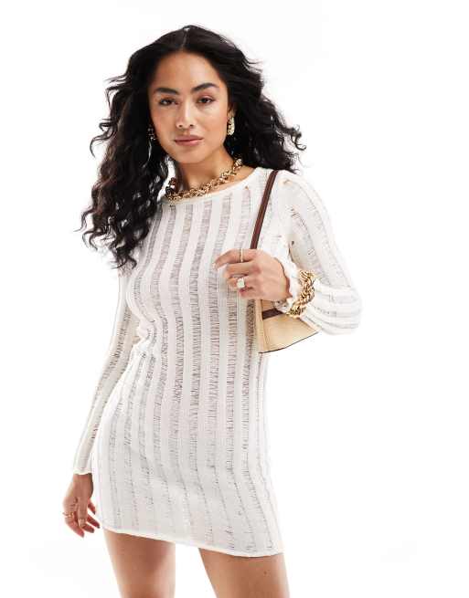 Bershka – Sukienka mini z ażurowej dzianiny o drabinkowym splocie w kolorze ecru