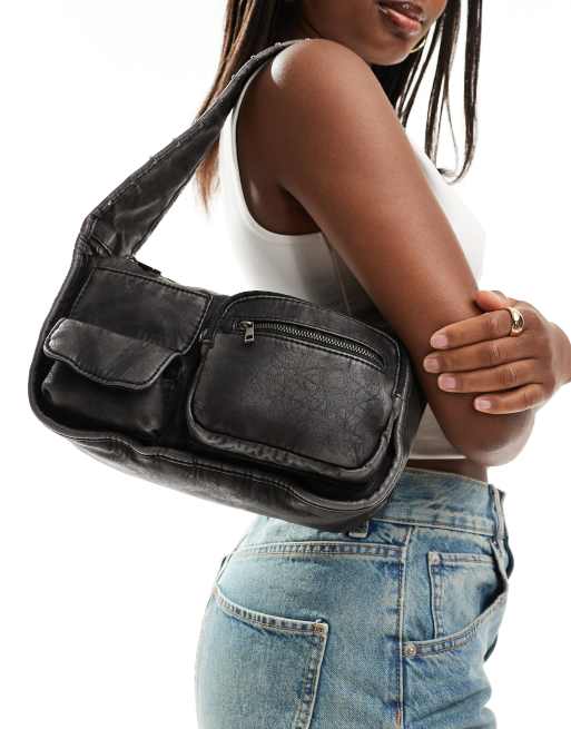 Bershka – Torebka na ramię z kieszeniami z imitacji skóry w spranym czarnym kolorze