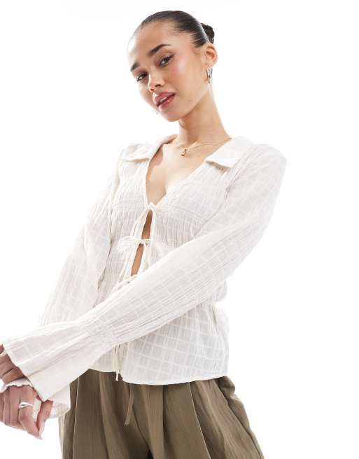 Bershka – Wiązana z przodu marszczona koszula w kolorze ecru