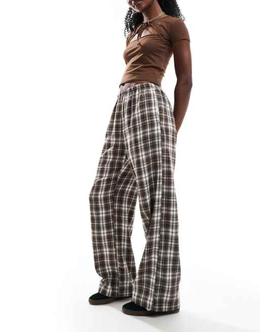 Bershka – Wiązane w talii spodnie z szerokimi nogawkami w brązową kratkę