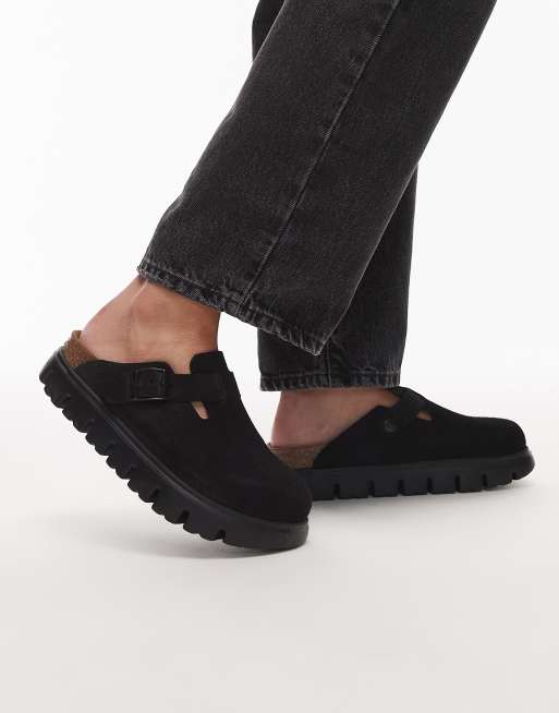 Birkenstock – Boston Papillio – Czarne zamszowe chodaki na grubej podeszwie