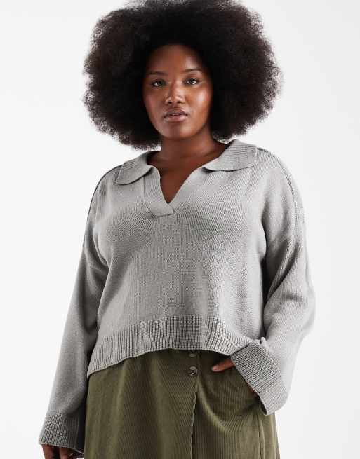 Brave Soul Curve – Grafitowoszary sweter z kołnierzykiem polo i szerokimi rękawami