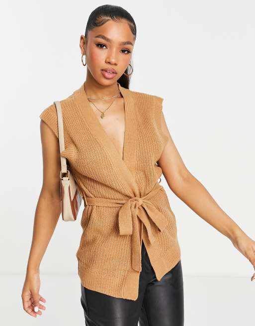 Brave Soul – Camelowy wiązany w talii kardigan bez rękawów