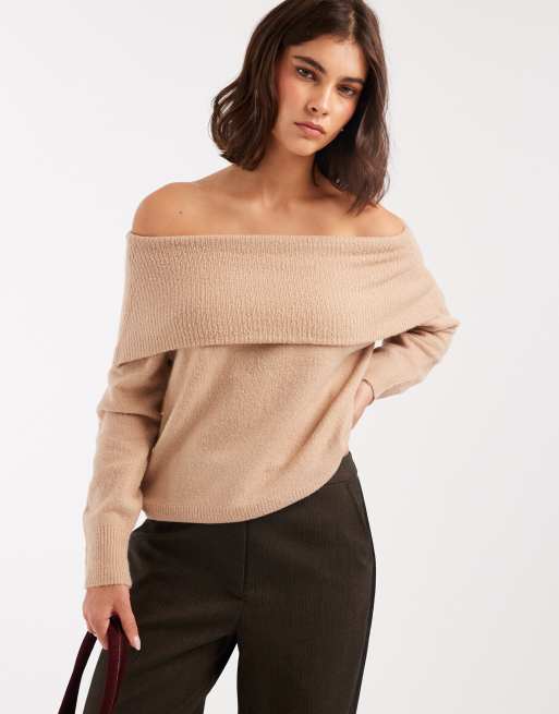 Brave Soul – Dzianinowy sweter z dekoltem bardot w kolorze szarego beżu