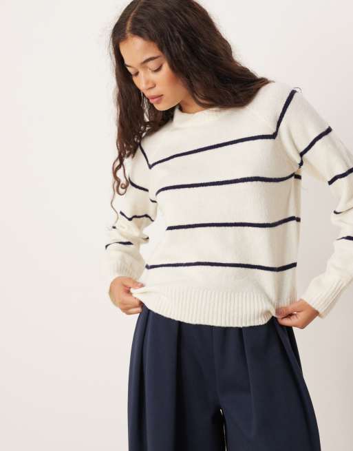 Brave Soul – Dzianinowy sweter z okrągłym dekoltem w kolorze kości słoniowej w granatowe paski