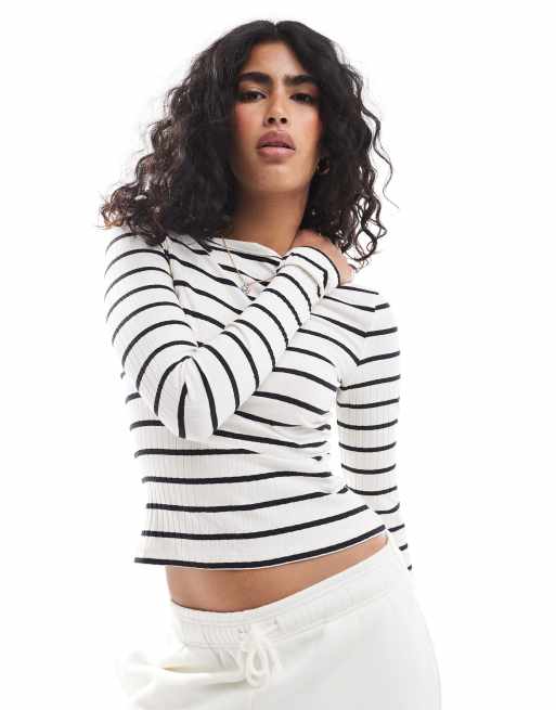 Brave Soul – Top z długim rękawem i dekoltem w łódkę w kremowo-czarne paski