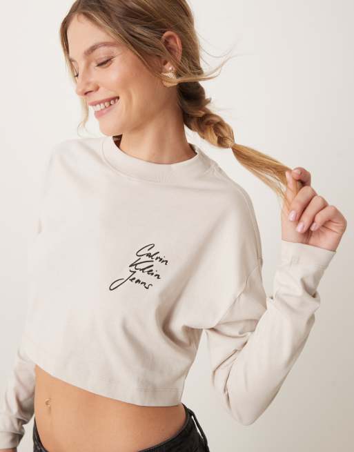 Calvin Klein Jeans – Beżowy krótki T-shirt z długimi rękawami i logo