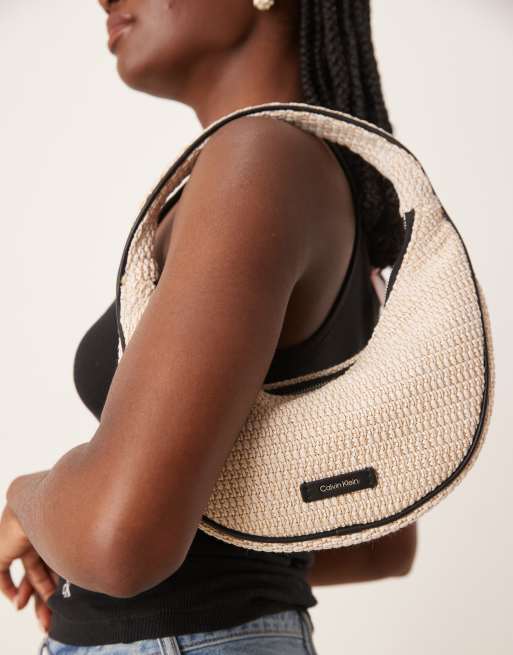 Calvin Klein Jeans – Kremowa zaokrąglona torba na ramię z raffii
