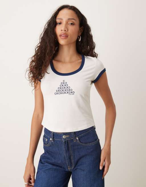 Calvin Klein Jeans – Krótki biały T-shirt z granatowymi lamówkami