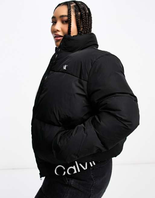 Calvin Klein Jeans Plus – Czarna krótka kurtka ocieplana z logo u dołu