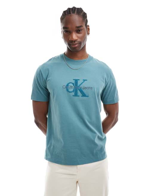 Calvin Klein Jeans – Turkusowy szenilowy T-shirt z logo z monogramem