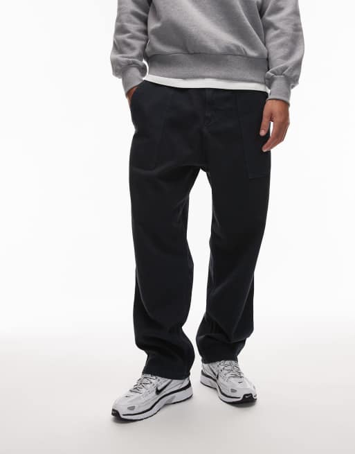 CAT – WWR – Granatowe spodnie o luźnym kroju z grubego diagonalu z klamrą