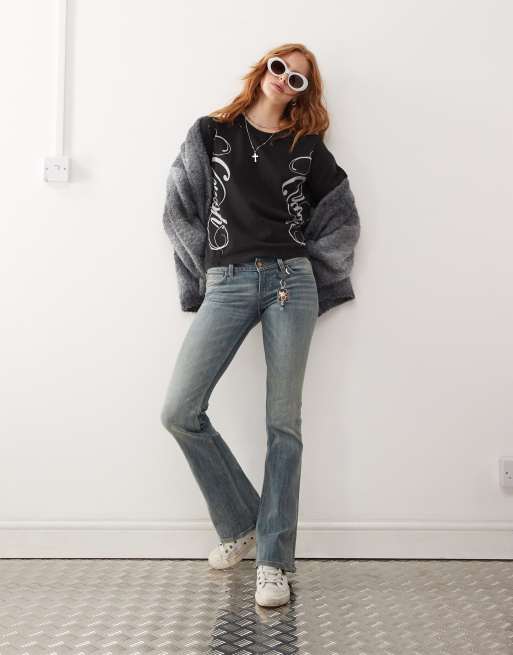 Cheap Monday – Booty Bei – Niebieskie jeansy typu bootcut ze stretchem, obniżonym stanem i efektem odbarwienia