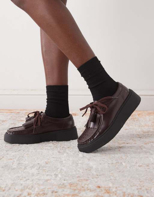 Clarks – Torview – Ciemnofioletowe skórzane buty z frędzlami we wzór w jodełkę