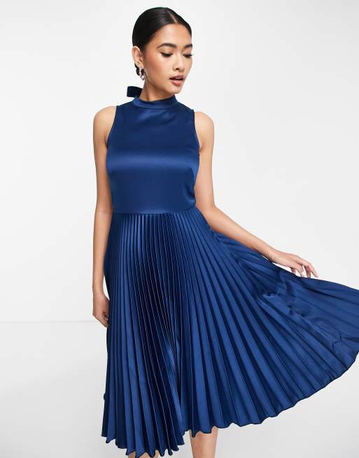 Closet London – Granatowa plisowana sukienka midi z zabudowanym dekoltem