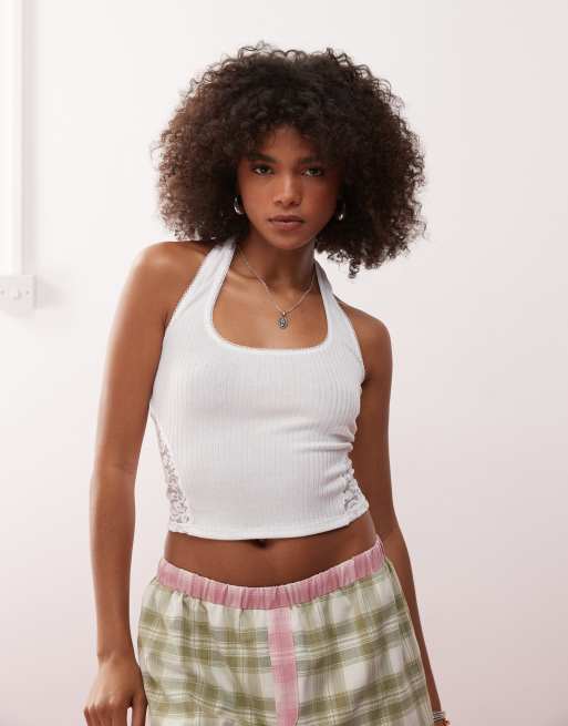 COLLUSION – Biały prążkowany top z dekoltem halter i koronkowymi wstawkami
