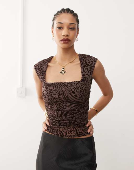 COLLUSION – Brązowy drapowany top z kwadratowym dekoltem i krótkimi rękawkami w wypalony wzór w panterkę