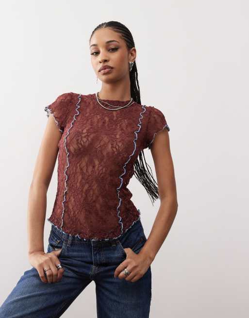COLLUSION – Brązowy koronkowy top z rękawami zakrywającymi ramiona i niebieskim szwem