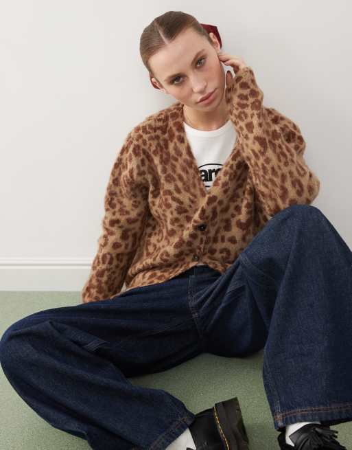 COLLUSION – Brązowy puszysty kardigan z dekoltem w szpic we wzór w panterkę