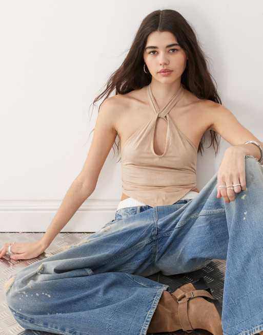 COLLUSION – Brązowy top ze skręconym dekoltem z imitacji zamszu