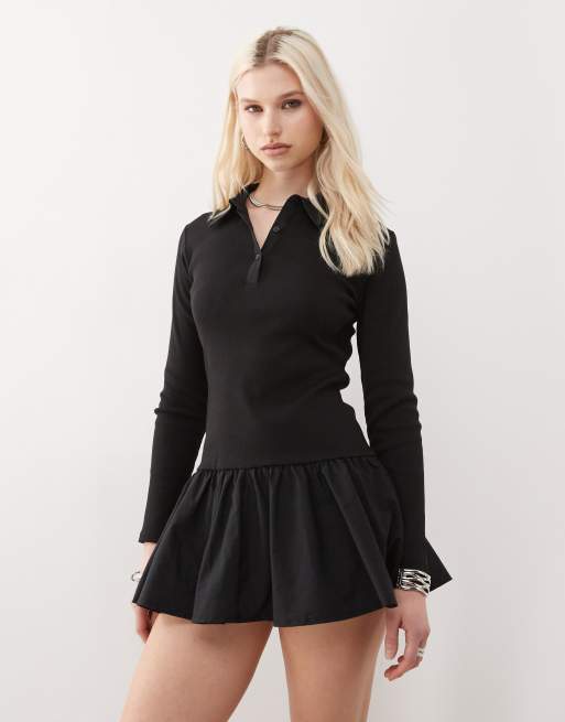 COLLUSION – Czarna prążkowana sukienka mini z kołnierzykiem polo i obniżoną talią