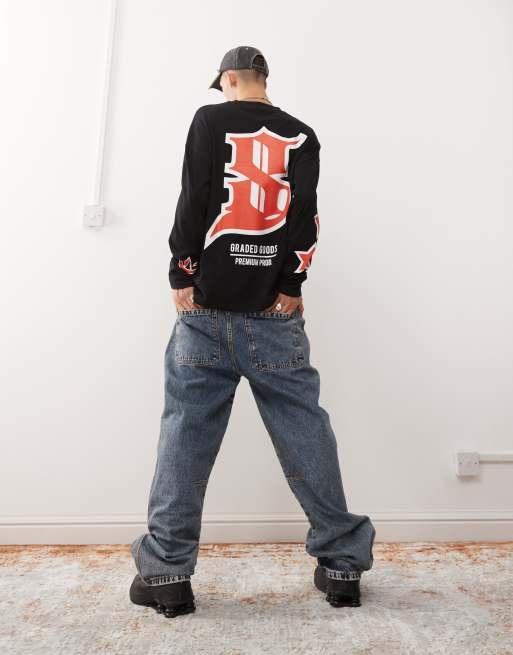 COLLUSION – Czarny gruby T-shirt z czerwoną grafiką i długimi rękawami