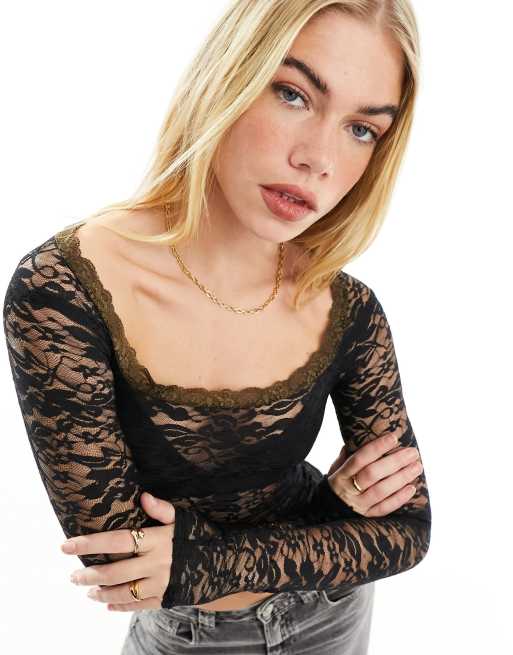 COLLUSION – Czarny koronkowy T-shirt z długimi rękawami i kwadratowym dekoltem