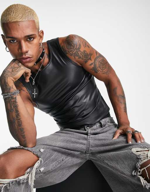 COLLUSION – Czarny krótki podkoszulek z imitacji skóry