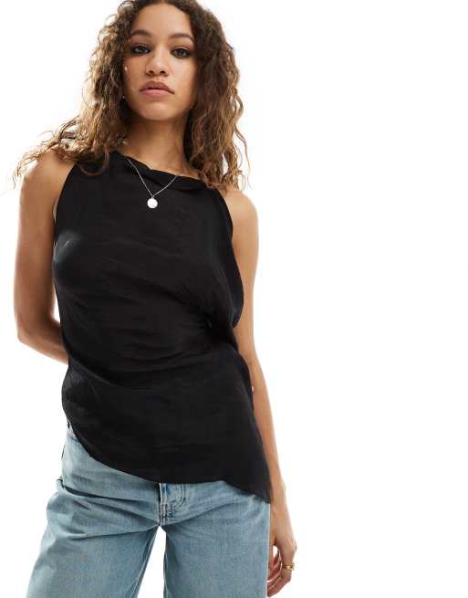 COLLUSION – Czarny prześwitujący asymetryczny top o wydłużonym fasonie z paseczkami na plecach