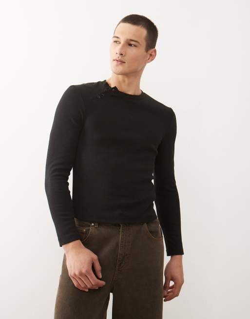 COLLUSION – Czarny top z długimi rękawami i asymetrycznym dekoltem henley z zapięciem na guziki