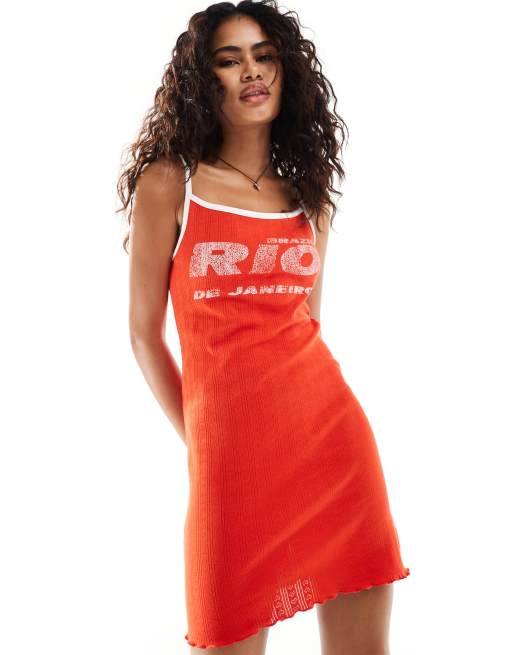 COLLUSION – Czerwona sukienka mini na ramiączkach o splocie pointelle z napisem „Rio”
