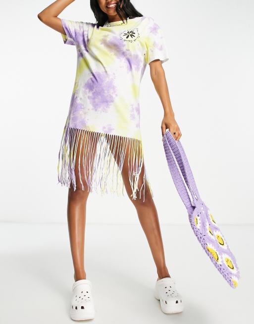 COLLUSION – Fioletowa sukienka t-shirtowa z efektem tie-dye i frędzlami
